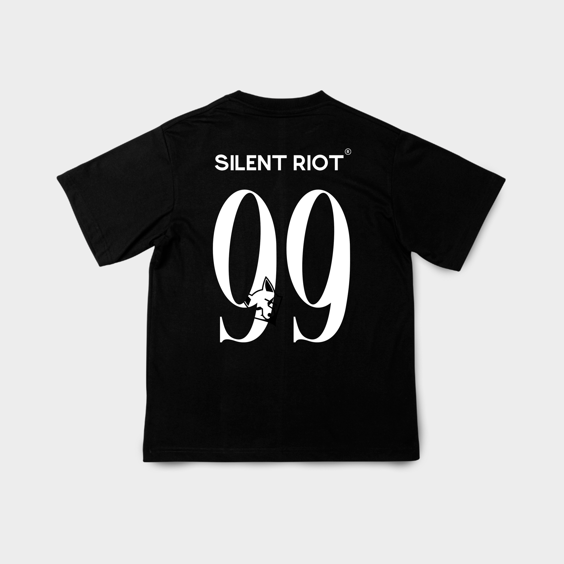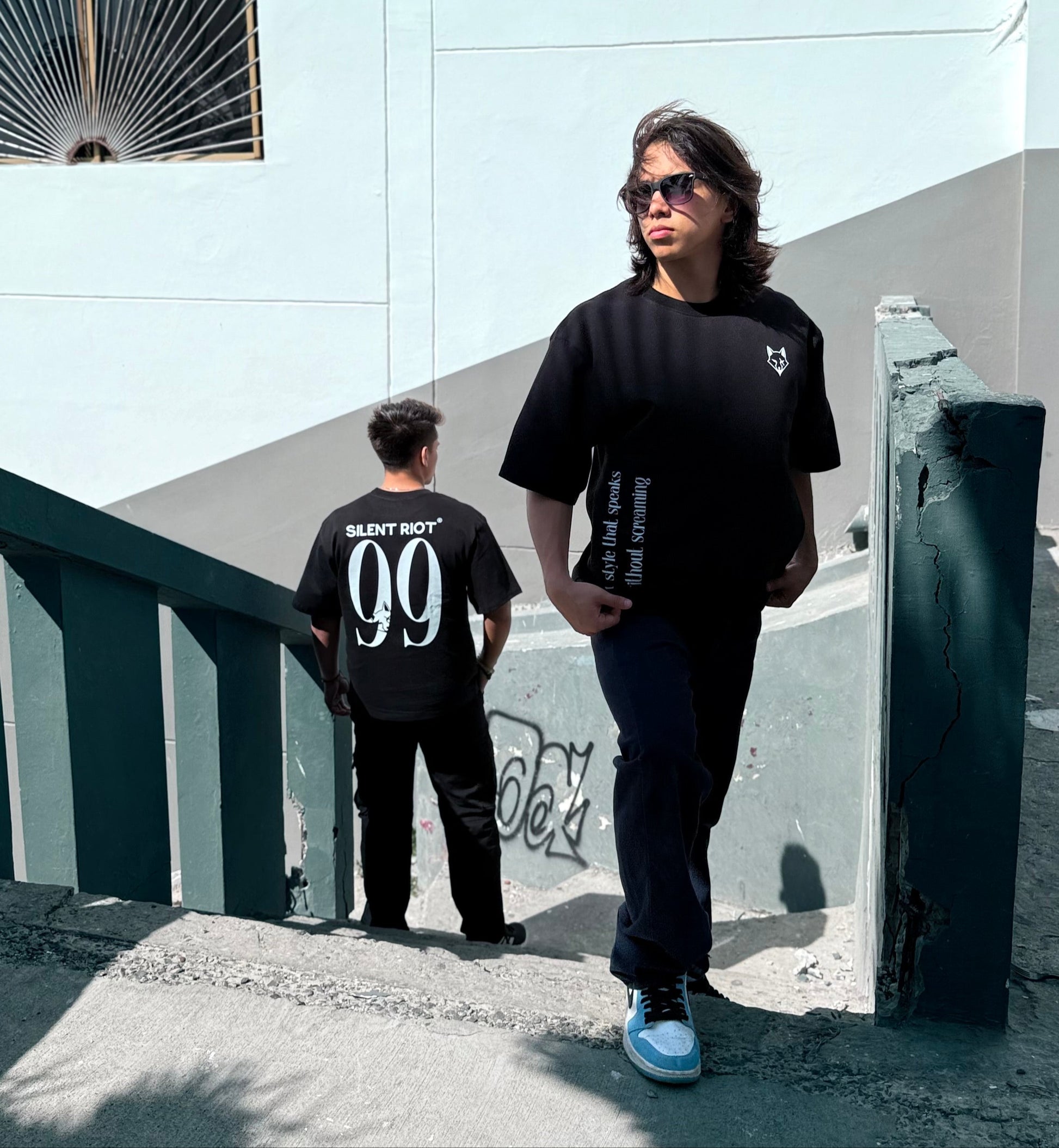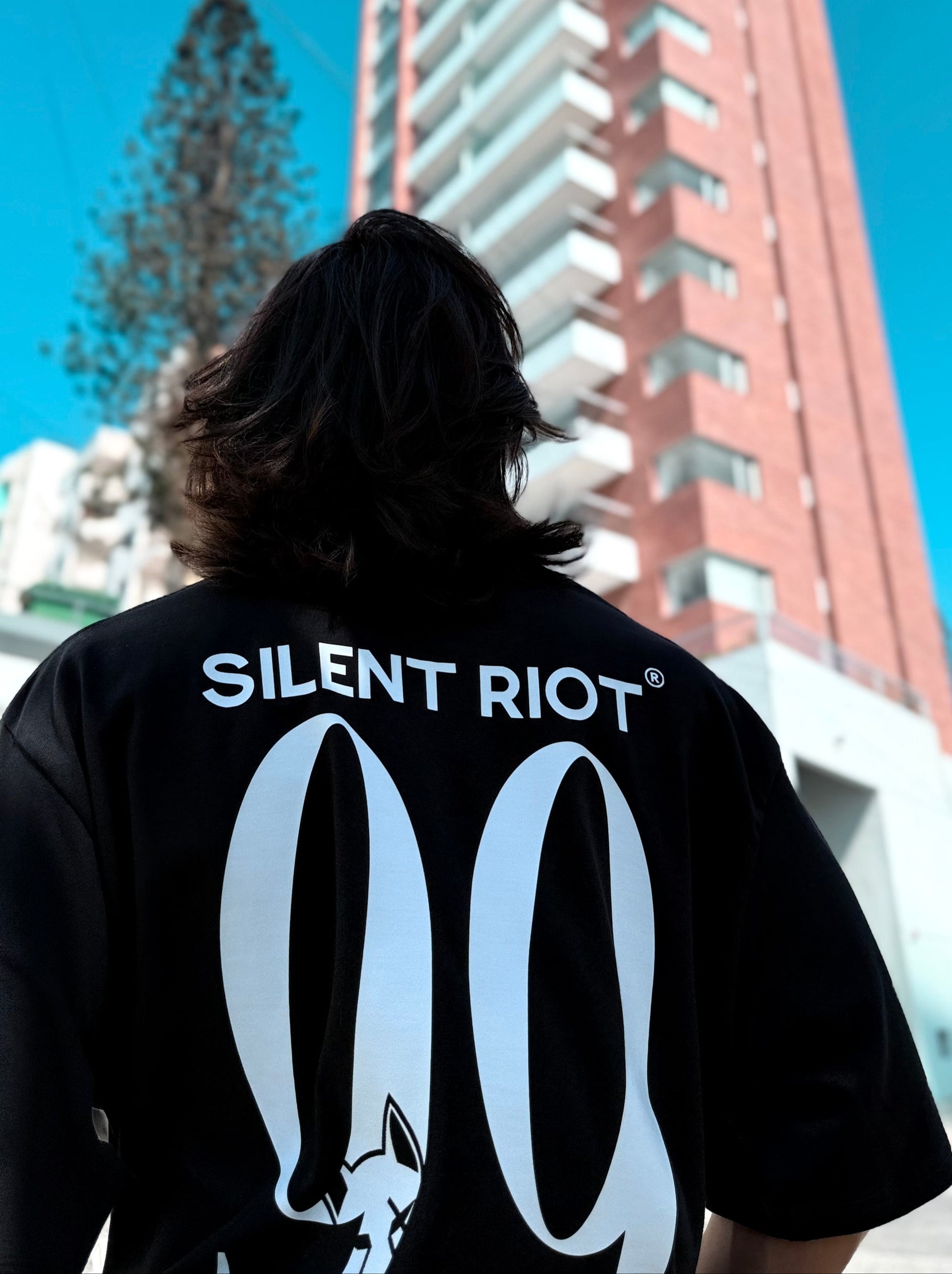 Un básico imprescindible en negro con corte oversize y un diseño único. En el pecho destaca un logo minimalista que refleja la esencia de Silent Riot, mientras que las mangas incorporan una banda tejida con el nombre de la marca, un detalle sutil pero icónico del streetwear.