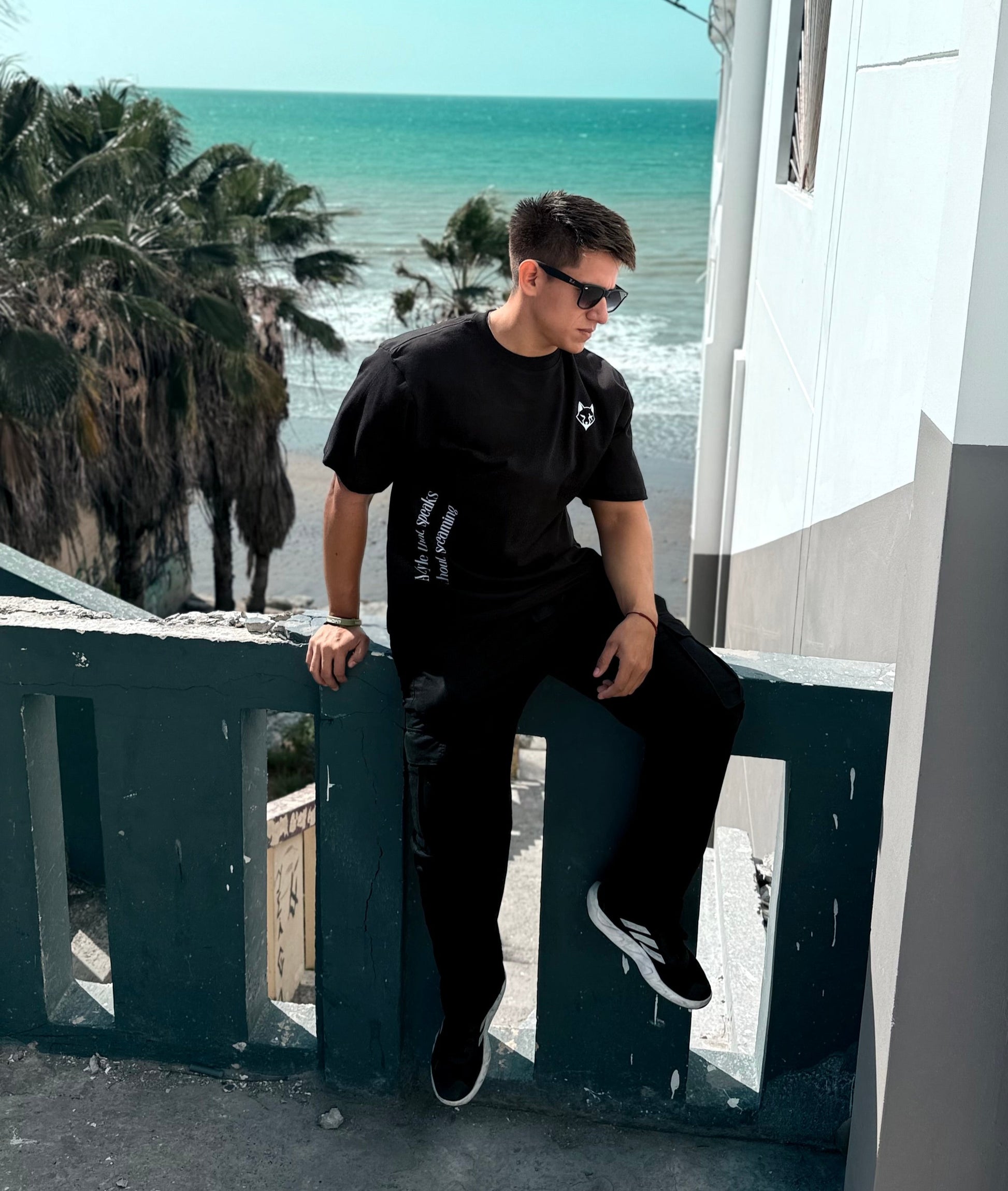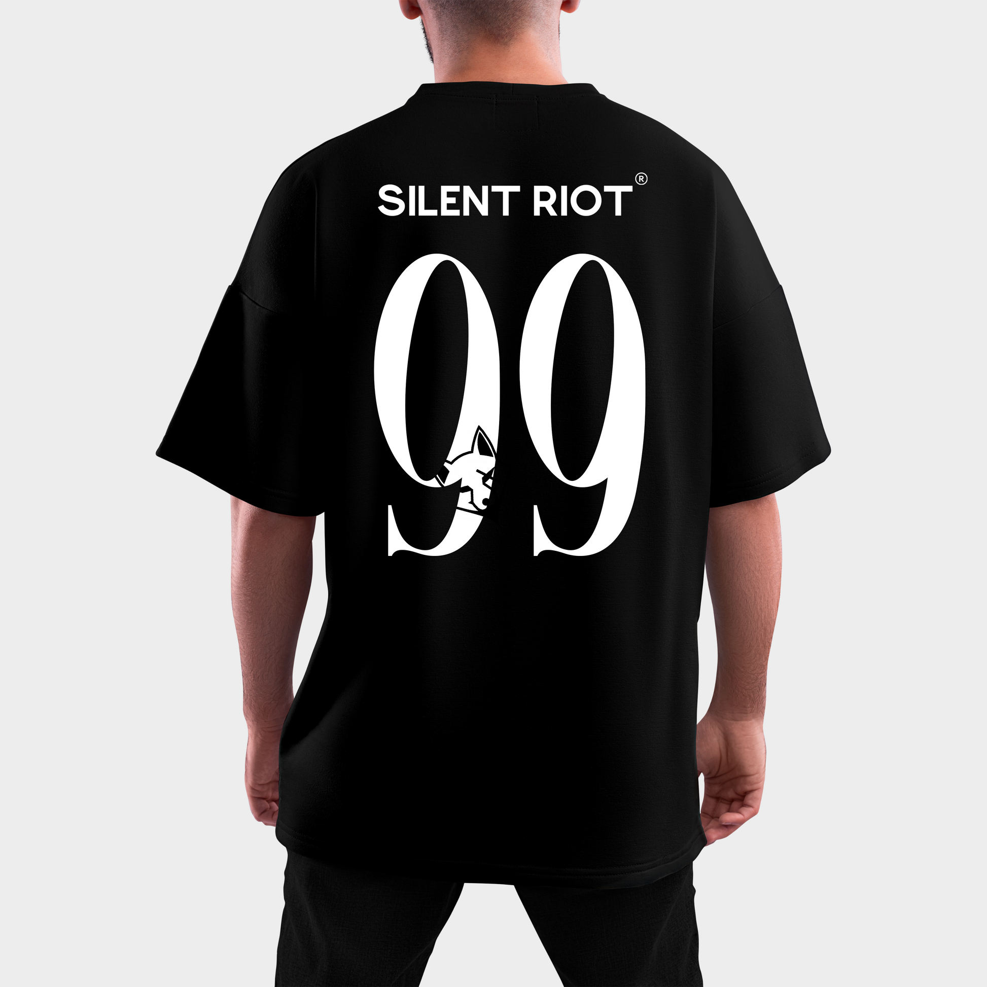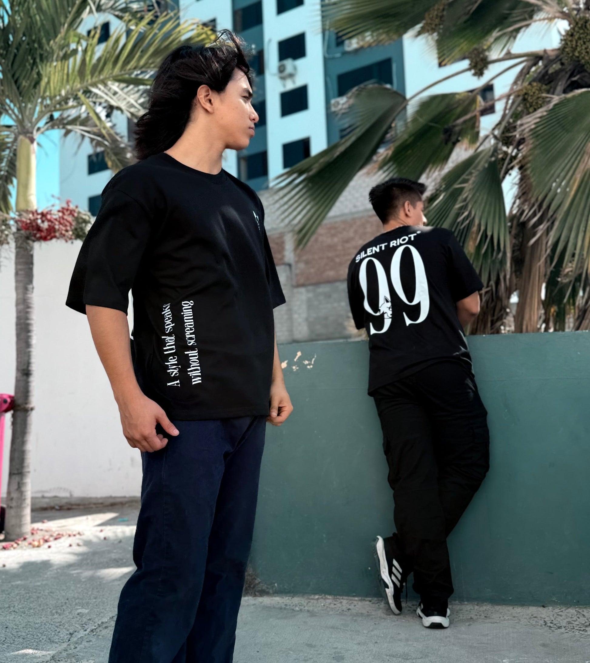 Un básico imprescindible en negro con corte oversize y un diseño único. En el pecho destaca un logo minimalista que refleja la esencia de Silent Riot, mientras que las mangas incorporan una banda tejida con el nombre de la marca, un detalle sutil pero icónico del streetwear.